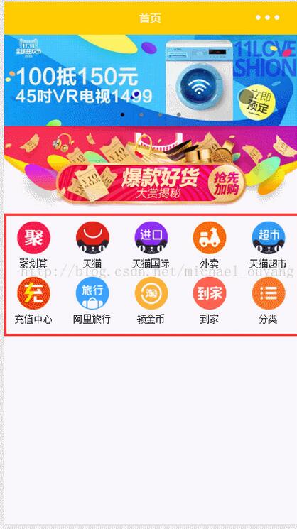 分类入口,已经成为了商城项目必须的布局之一,这里以仿照淘宝的分类入口来做案例 下图红框部分,就是本文重点讲解部分,另外本文并没有写点击某个入口跳转页面。 如需学习页面跳转的同学,可以参考此文 微信小程序的页面跳转和参数传递 —— 微信小程序教程系列(6)