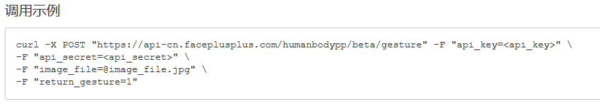从实例上不难看出,向 https://api-cn.faceplusplus.com/humanbodypp/beta/gesture 发送请求,默认的参数有 api_key,api_secret,image_file。api_key和api_secret可以通过控制台进行生成。