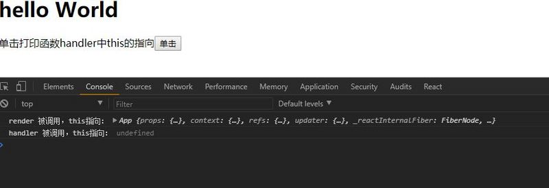 将this.handler()绑定为组件实例后,this.handler()中的this就指向组将实例,即onClick={this.handler}打印出来的为组件实例;