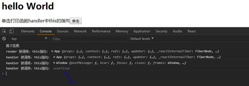 测试:分别在组件自带的生命周期函数以及自定义函数中打印this,并在render()方法中分别使用this.handler(),window.handler(),onCilck={this.handler}这三种方法调用handler():