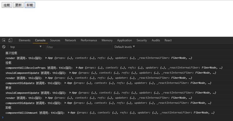 使用三个按钮触发组件的装载、更新和卸载过程:
