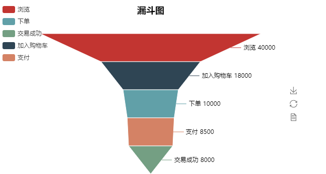 funnel.add("商品交易行为记录数据", ['浏览','加入购物车','下单','支付','交易成功'], [40000,18000,10000,8500,8000], is_label_show=True,label_formatter='{b} {c}',label_pos="outside",legend_orient='vertical', legend_pos='left')