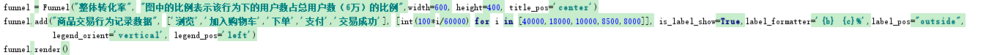funnel.add("商品交易行为记录数据", ['浏览','加入购物车','下单','支付','交易成功'], [int(100*i/60000) for i in [40000,18000,10000,8500,8000]], is_label_show=True,label_formatter='{b} {c}%',label_pos="outside",