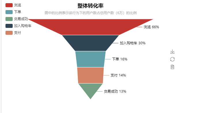 funnel = Funnel("整体转化率", "图中的比例表示该行为下的用户数占总用户数(6万)的比例",width=600, height=400, title_pos='center')