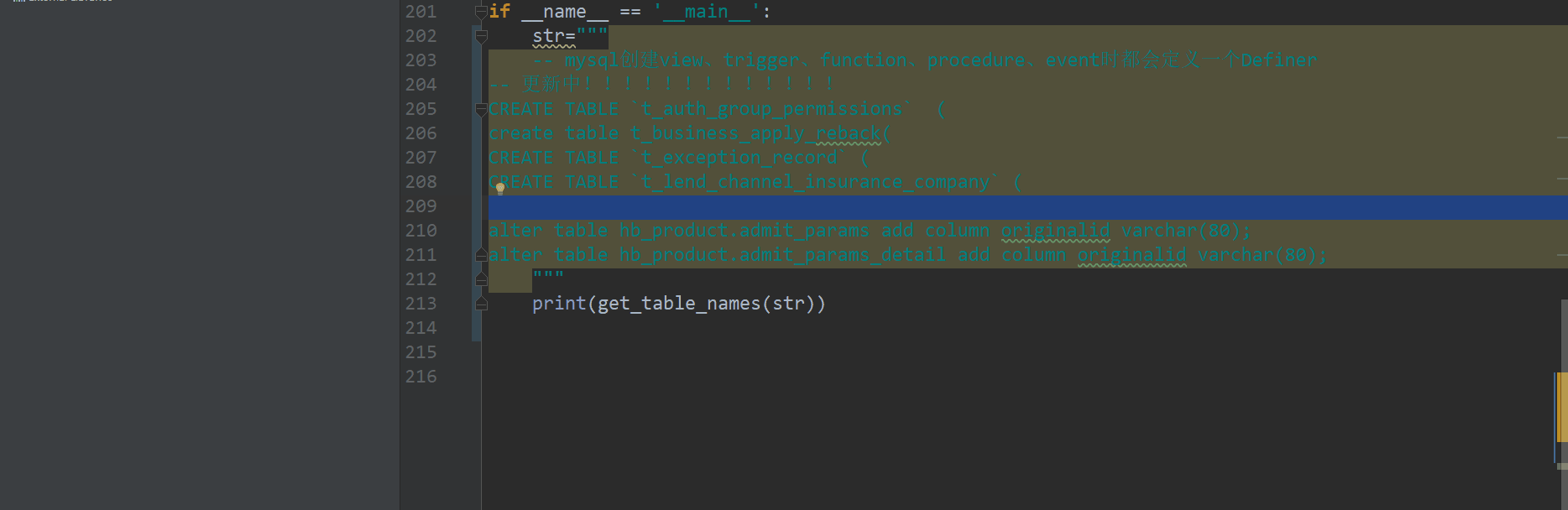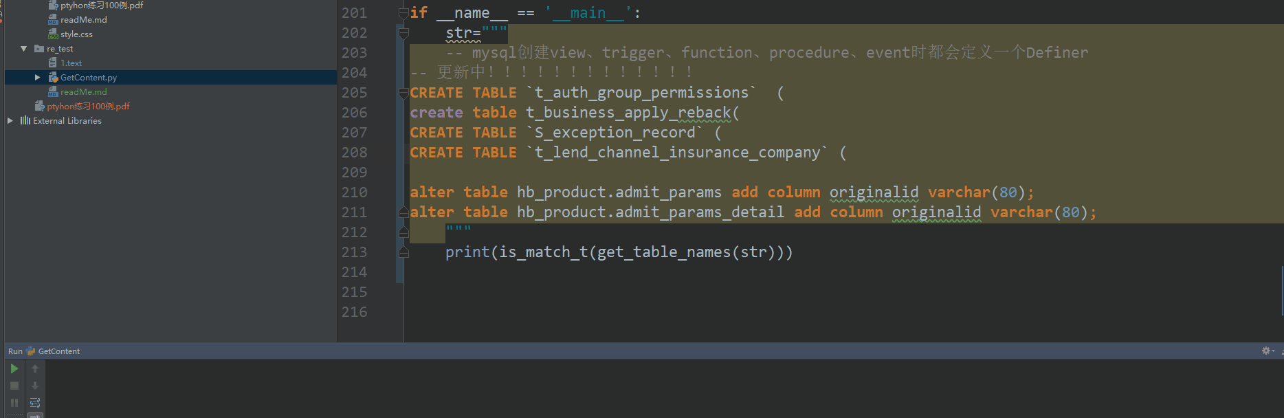 - flags=re.I 匹配时忽略大小写,因为我们的表的创建语句CREATE TABLE或create table t_business_apply_reback