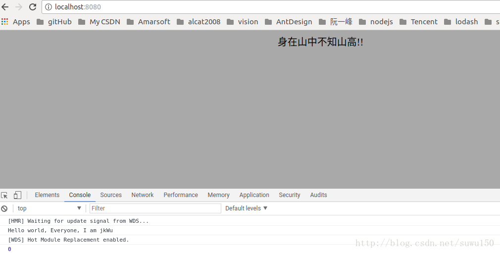 也就是将路径进行修改,因为在webpack.config.json文件中进行了服务器路径的配置,修改了 publicPath: "/assets/",项,在命令行执行npm run start能看到服务器正常启动,然后我们去浏览器进行访问,如下所示结果: