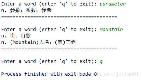 针对上述过程,对于熟悉爬虫的读者来说,是不难完成将输入的单词的中文意思从网页中提取出来的。笔者的代码如下: