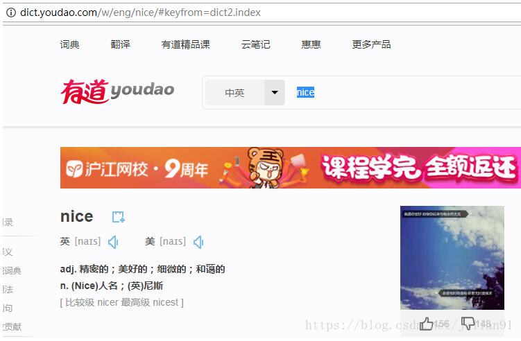 首先我们的爬虫要能将英语单词翻译成中文,因此,我们就需要一个网站帮助我们做这件事情。于是,我们选定有道词典,网址为: http://dict.youdao.com/ 。在该网页中我们输入单词nice,就会出来这个单词的意思,如下图: