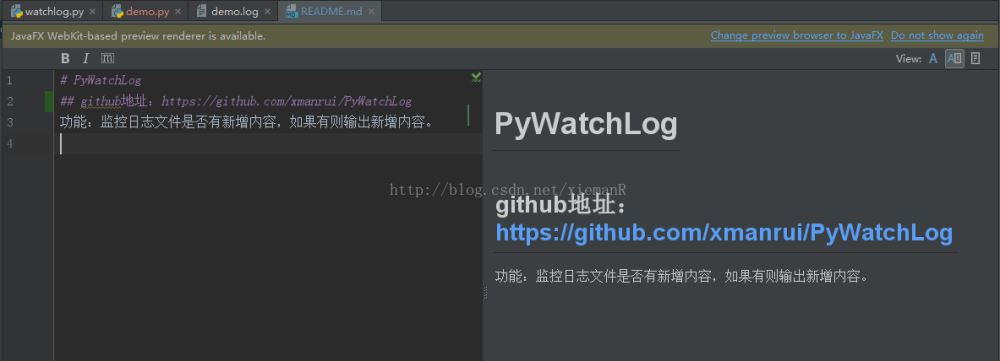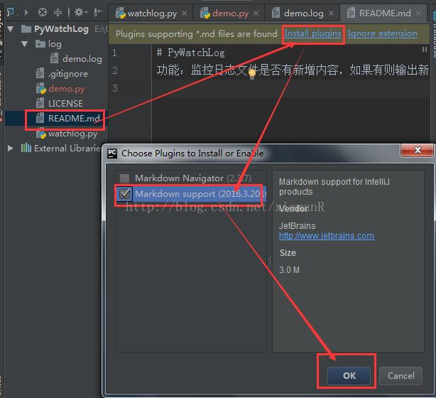 在PyCharm打开PyWatchlog工程后打开README.md文件,文件上方会有安装Markdown插件的提示。