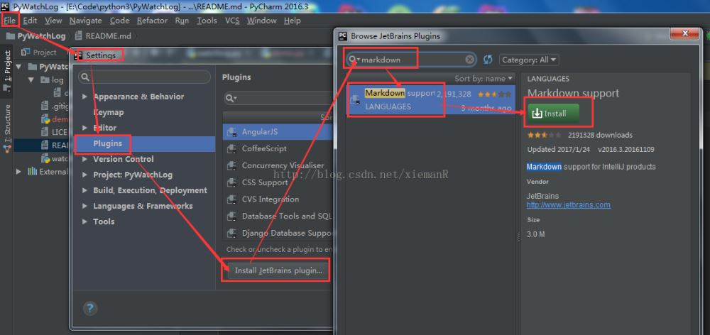 从github下载的代码一般都会带有README.md文件,该文件是一个Markdown格式的文件。PyCharm是默认没有安装Markdown插件的,所以不能按照Markdown格式显示文本,显示的是原始文本。下面已github库PyWatchlog的代码为例介绍两种安装Markdown的方法。