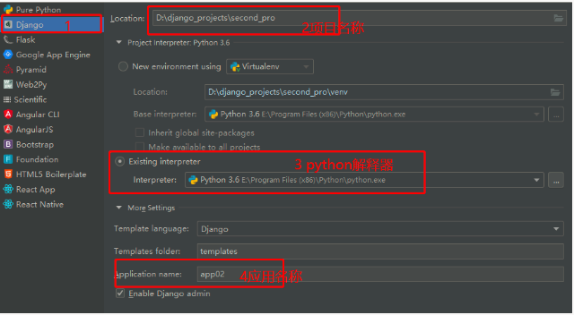 2.Django -->项目名称 -->选择Python选择器 -->应用名称(业务逻辑相关的程序)