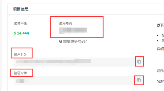 在上方图片中有用的信息有三个:试用号码,账号SID,和验证令牌,后两个用右边的复制按钮进行复制