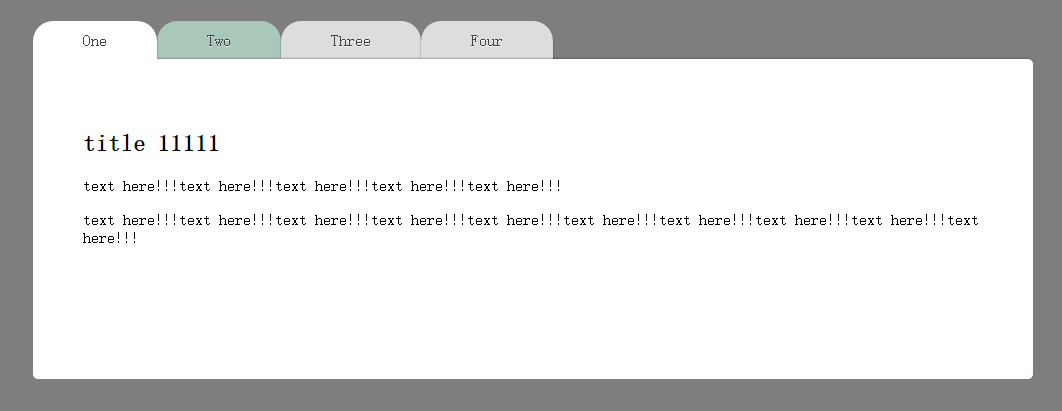 (1)点击tab栏显示对应的内容,并且tab栏样式变化。实现方式:一般tab栏如果要做成比较好看的样式,会切两张图作为背景,一张用于选中时的背景,一张用于未选中的背景。这里为了简单,只用css设置样式。然后为每个tab绑定click事件,当触发click事件时,对应的内容div的display设置block,否则设置为none。