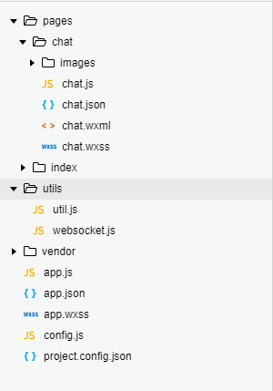 在utils目录下,是封装了websoket的请求过程,以便在chat.js中调用。需要注意的是wx.connectSocket代表客户端首次和服务器建立联系,wx.onSocketOpen才是正式打开通道,wx.onSocketMessage必须在 wx.onSocketOpen 回调之后发送才生效。