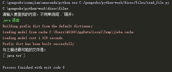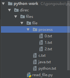 运行后,我们会有如下目录:其中process文件夹下的是提取关键词后的结果,文件名对应索引,即{0:"c.txt",1:"java.txt",2:"python.txt"}