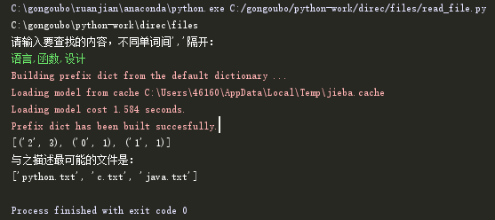 基本的内容我们有了,再考虑我们的输入,我们希望实现在控制台输入几个单词,找到最符合的几个文件。我们将输入存储为单词列表,以此判断该单词是否出现在文件中,如果出现了,我们将该单词对应的文件的索引+1,否则继续判断下一个单词。之后我们得到了关于文件索引次数的字典,我们按次数从大到小排列,然后取前几个作为我们最后的结果。当然,我们需要的是原始的文件名,因此,我们还要将索引映射回文件名,相关代码如下: