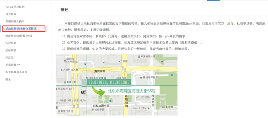 逆地址解析提供由坐标到坐标所在位置的文字描述的转换,调用形式就是一个HTTP URL形式的API,基本用法如下: