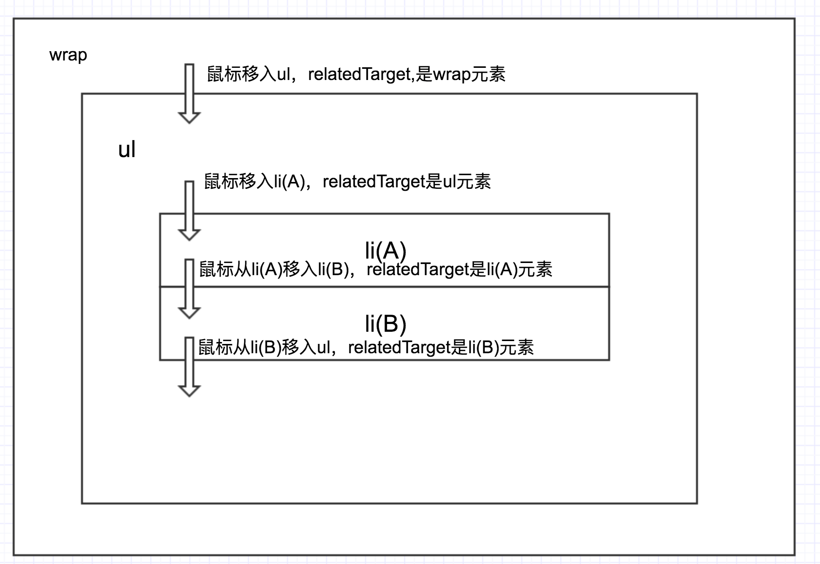 ul的父元素wrap(移入ul时,此时也是触发mouseenter事件的时候, 其实不一定,后面会说明 ), 或者ul元素本身(在其子元素上移出时), 又或者是子元素本身(直接从子元素A移动到子元素B)。