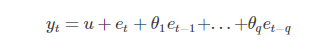MA模型描述的是当前值与自回归部分的误差累计的关系,滞后q阶的MA模型可以表示为: