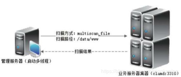 本次实践实现了一个集中式的病毒扫描管理,可以针对不同业务环境定制扫描策略,比如扫描对象、描述模式、扫描路径、调度频率等。案例实现的架构图如下,首先业务服务器开启clamd服务(监听3310端口),管理服务器启用多线程对指定的服务集群进行扫描,扫描模式、扫描路径会传递到clamd,最后返回扫描结果给管理服务器端。