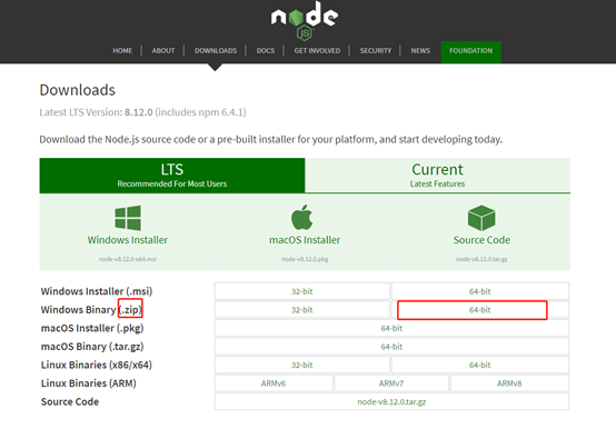 本次下载LTS长期支持版,.zip解压版本(当然也可以使用安装版.msi),点击右侧[64-bit]即可下载.