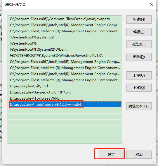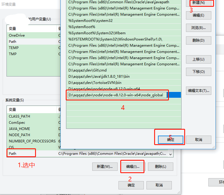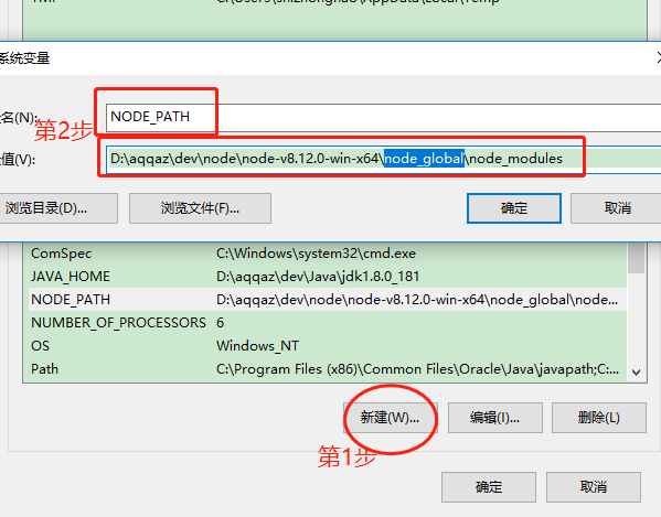 在【Path】中新增D:\aqqaz\dev\node\node-v8.12.0-win-x64\node_global