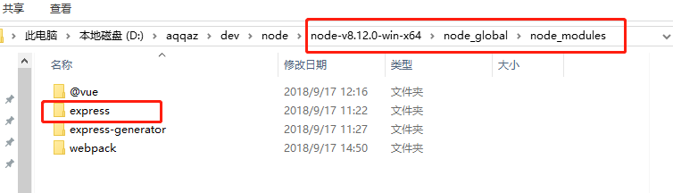 D:\aqqaz\dev\node\node-v8.12.0-win-x64\node_global\node_modules目录下会出现express文件夹