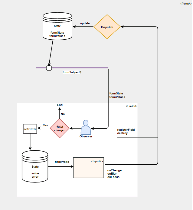 与 Redux Form 不同的是,我们不会将 form 的状态存储在 store 中,而是直接保存在 <Form/> 组件中。然后利用 RxJS 将数据通知给每一个 <Field/> ,然后 <Field/> 组件会根据数据去决定自己是否需要更新 UI,需要更新则调用 setState ,否则什么也不做。