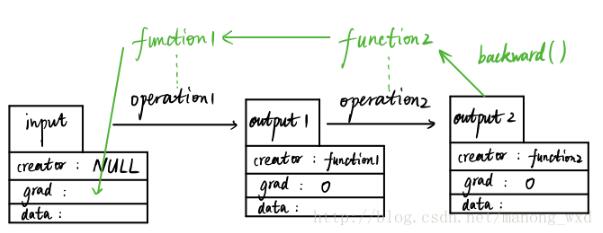 如图,假设我们有一个输入变量input(数据类型为Variable)input是用户输入的,所以其创造者creator为null值,input经过第一个数据操作operation1(比如加减乘除运算)得到output1变量(数据类型仍为Variable),这个过程中会自动生成一个function1的变量(数据类型为Function的一个实例),而output1的创造者就是这个function1。随后,output1再经过一个数据操作生成output2,这个过程也会生成另外一个实例function2,output2的创造者creator为function2。
