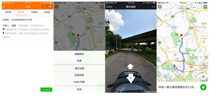从后端API获取到起始地和目的地的经纬度坐标与地名。用户点击起始地便打开地图展示坐标的附近街景,路线,或者打开外部地图。