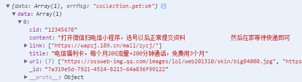 在前端想获取数据库某集合中的数据时,返回的参数data始终为空数组,如下: