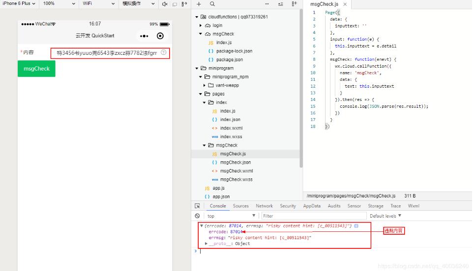 以下例子是调用小程序官方的API,如何调用API来进行对内容的安全检测: