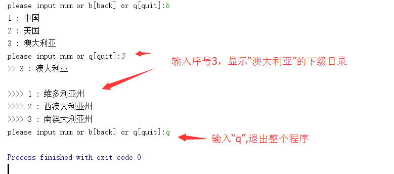1)正常输入,分别输入序号1,展示“中国”的下级目录,接着输入1,展示“河北”的下级目录,如下图所示: