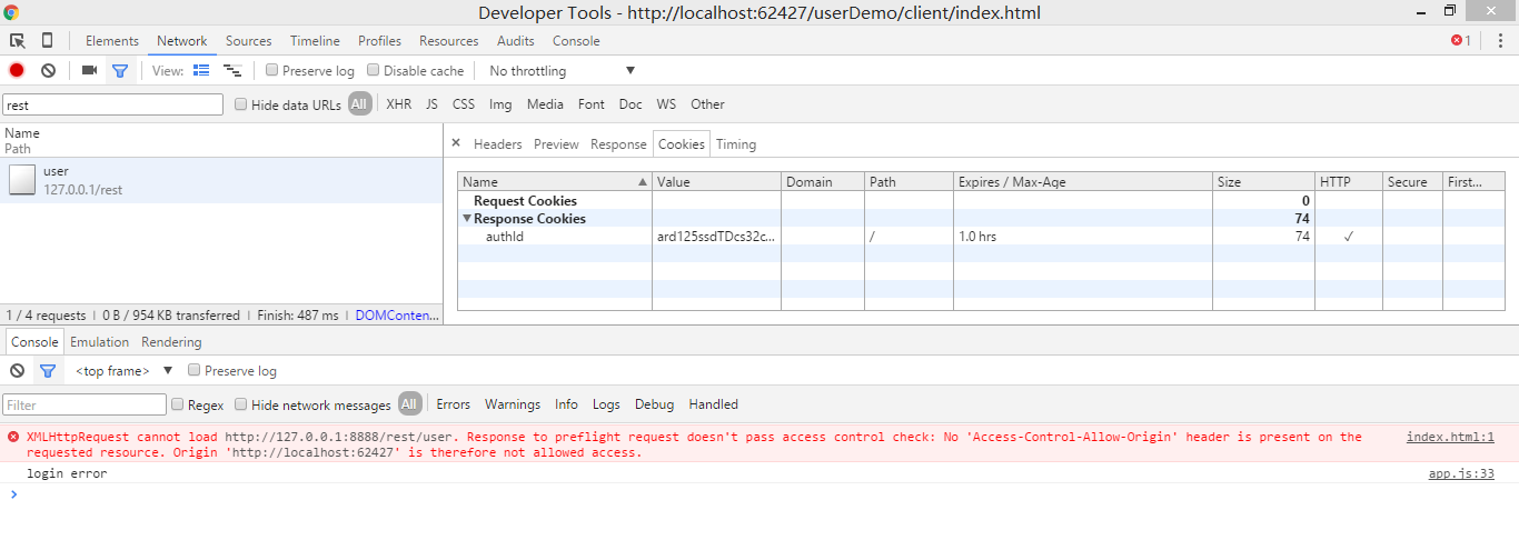 XMLHttpRequest cannot load http://127.0.0.1:8888/rest/user. Response to preflight request doesn't pass access control check: No 'Access-Control-Allow-Origin' header is present on the requested resource. Origin 'http://localhost:62427' is therefore not allowed access.