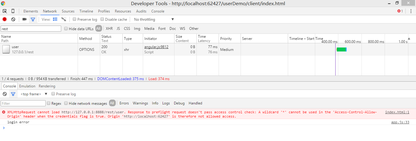 XMLHttpRequest cannot load http://127.0.0.1:8888/rest/user. Response to preflight request doesn't pass access control check: A wildcard '*' cannot be used in the 'Access-Control-Allow-Origin' header when the credentials flag is true. Origin 'http://localhost:62427' is therefore not allowed access.