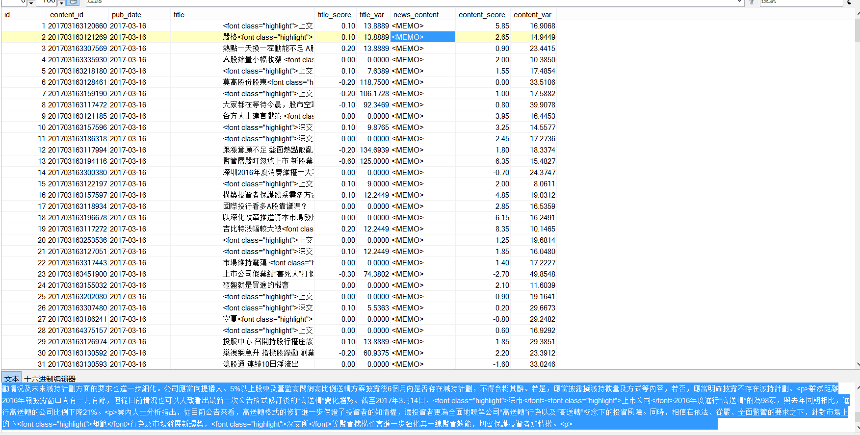要实现对news主体的读取,并且找到其中含有的股票名称,只要发现,就将这支股票和对应的日期、score写入数据库。