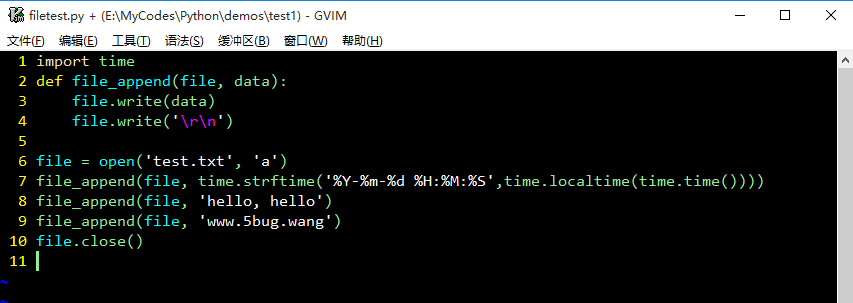 syntax enable 关键字高亮 set colorscheme murphy 更改背景颜色 set guifont=Consolas:h12 设置字体 set tabstop=4 一个tab键相当于4个空格键 set nu 显示行号 set ai 自动缩进 set si 智能缩进 set guioptions-=T 隐藏工具栏 set nobackup 不产生备份文件 nmap <F1> :w!<CR>:!python %<CR> 设置运行的快捷键 cd C:\Users\MyTest\AppData\Local\Programs\Python\Python36 设置Python安装路径
