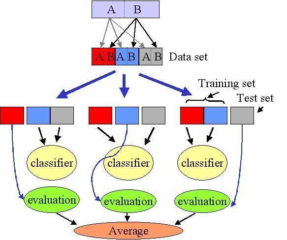 这样经过10次训练,得到10组准确率,将这10组数据求平均值得到平均准确率的结果。这里10是特例。一般意义上将数据分为k份,称该算法为K-foldcrossvalidation,即每一次选择k份中的一份作为测试集,剩余k-1份作为训练集,重复k次,最终得到平均准确率,是一种比较科学准确的方法。