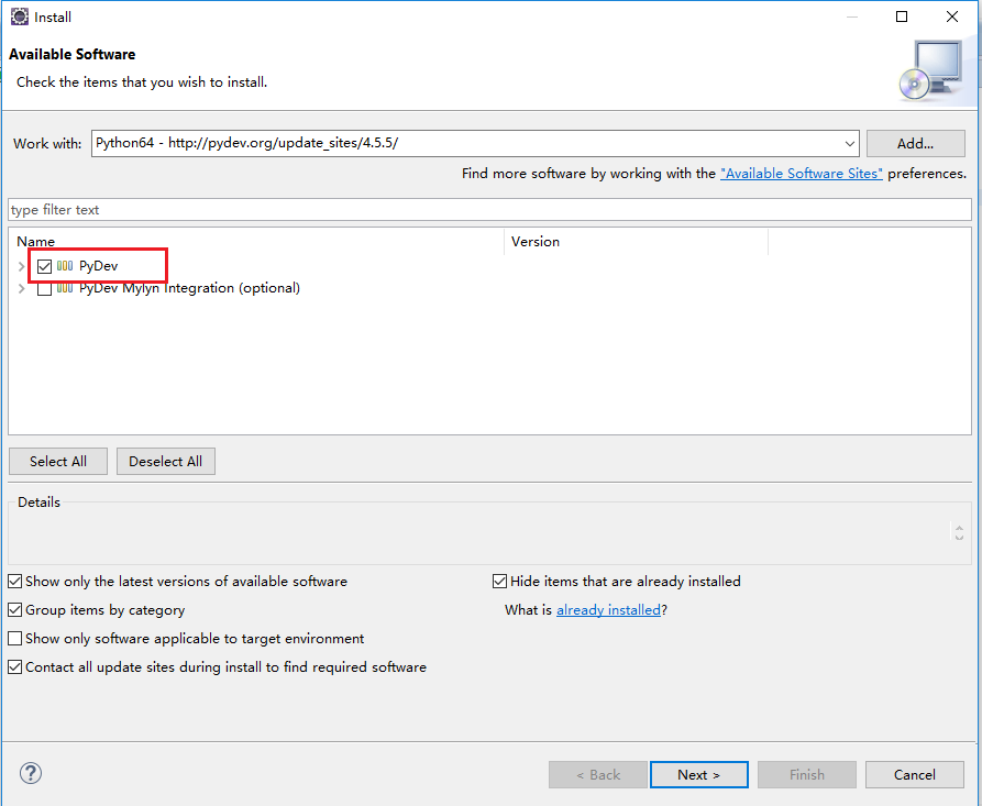 4.点击上图小对话中的"OK"按钮后,我们可以看到如下图所示界面,我们勾选上"PyDev",然后点击"Next",如下图所示。