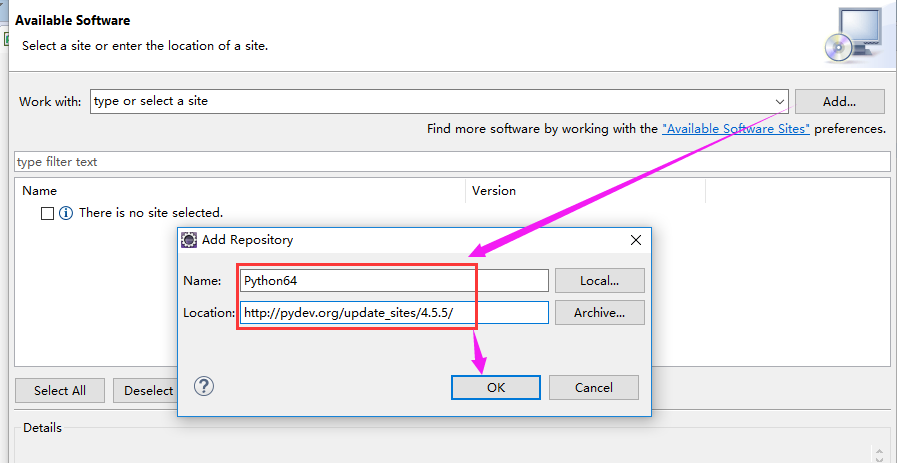 3.在弹出的小对话框中Name一栏输入"Python64"(可以随便写),Location一栏输入"http://pydev.org/update_sites/4.5.5/"这里之所以带上了版本,是因为如果只是写到http://pydev.org/updates的话,默认安装的是最新的版本,而新版本由于某些文件被防火墙“墙”掉了,因此安装总是会出错。我的jdk版本是1.7而jdk1.7对应的版本是到4.5.5,因此这里选择的是4.5.5版本。