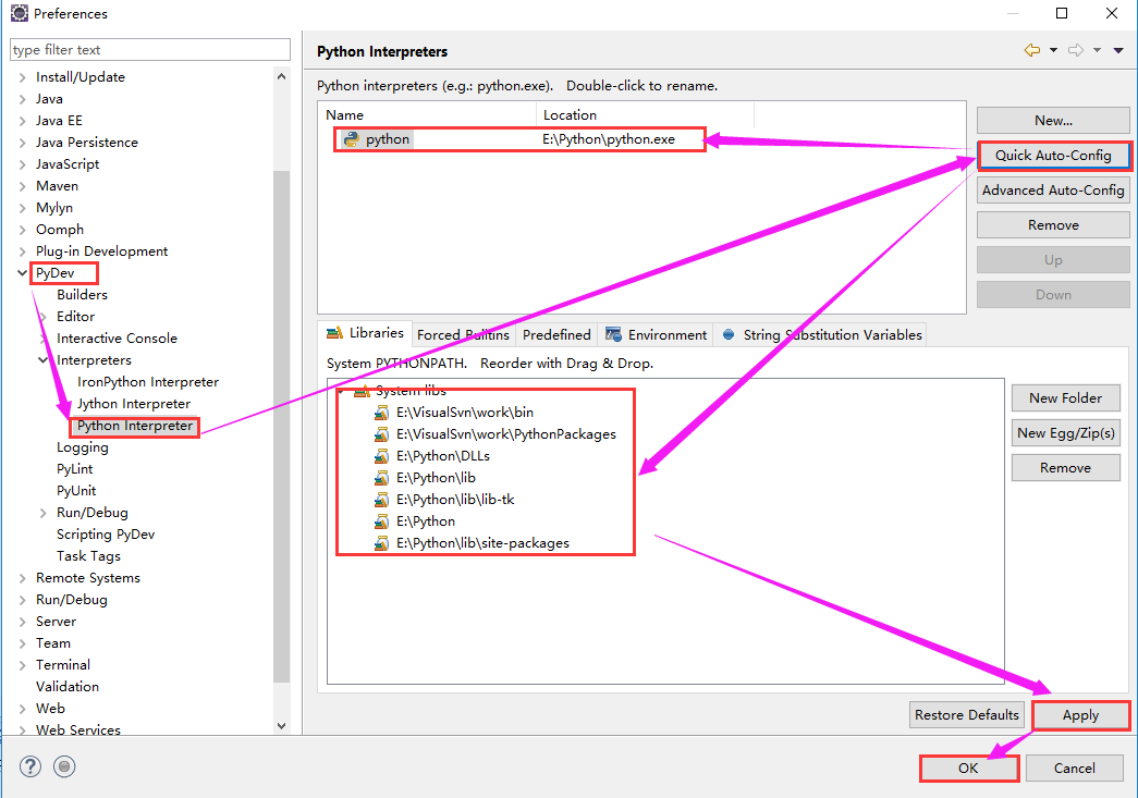 6.重启Eclipse之后,我们点击"Windows"----->"Preferences",会出现如下图所示的界面:我们先在左侧找到"PyDev",然后展开,展开后找到"Python Interpreter"并点击它,然后我们可以看到右侧所示界面,我们点击"Quick Auto-Config",就会自动为我们配置好,然后我们点击"Apply"和"OK"按钮即可。