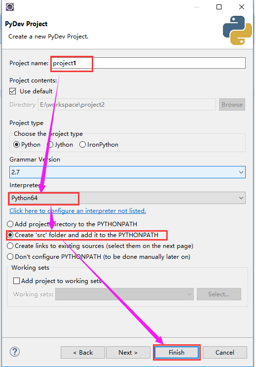 弹出的对话框如下图所示,我们输入工程名、选择好PyDev(我们安装的时候起名为"Python64"了),单选框选择"Create 'src' folder and add it to the PYTHONPATH",最后点击"Finish"。