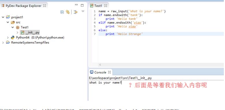 我们看控制台,可以看到输出了"What is your name?",其实这时程序还未执行完,我们把鼠标放到"?"后面发现光标是输入状态的,是可以输入内容的。