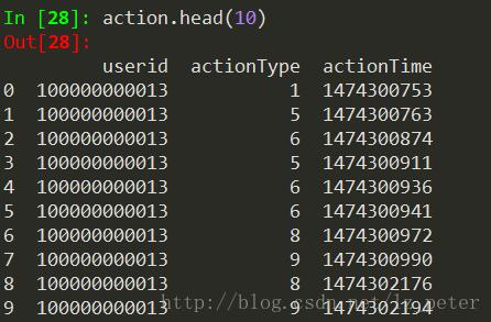 action表共有3列:userid、actionType和actionTime,分别代表用户id,用户行为类型和行为发生时间。具体格式如下图所示: