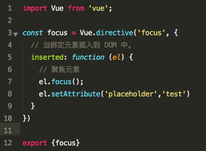 第二步:利用Vue.directive()建立一个全局命令,并将它暴露出来,例如一个focus 让表单自动聚焦