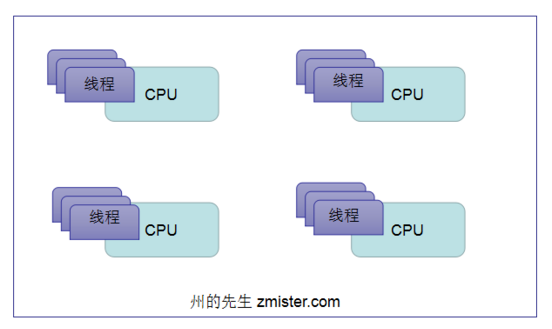 下面这个图片展示了多个线程在多个CPU中的存在方式: