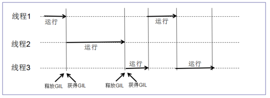 上面这个图说明了多个线程如何被GIL阻塞。每个线程必须等待获取到GIL才能进行下一步的运行,然后再释放GIL。线程之间使用随机循环的方式,所以并不能控制和保证哪个线程会先得到GIL。
