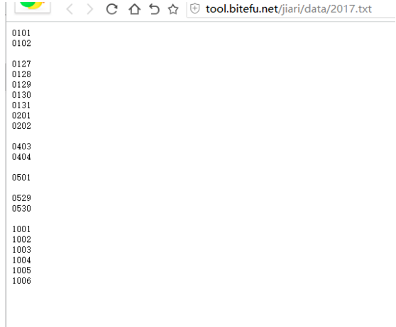 http://tool.bitefu.net/jiari/data/2017.txt是一个提供2017年所有节假日的文本文件: