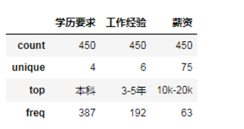结果中的 unique 表示的是在该属性列下面存在的不同值个数,以学历要求为例子,它包含【本科、大专、硕士、不限】这4个不同的值,top 则表示数量最多的值为【本科】,freq 表示出现的频率为 387。由于薪资的 unique 比较多,我们查看一下存在什么值。