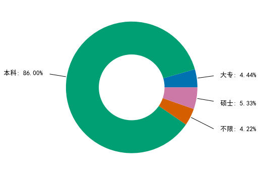 我们再把学历要求和薪资的数据稍微处理一下变成字典形式,传进绘制好的环状图函数就行了。另外,我们还要对【任职要求】的文本进行可视化。